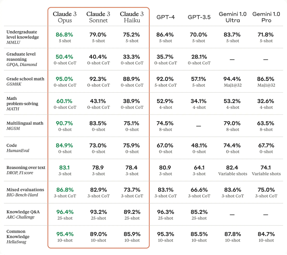 Opus là mô hình thông minh nhất trong gia đình mô hình Claude 3, vượt trội hơn các mô hình khác trong nhiều tiêu chuẩn đánh giá hệ thống AI phổ biến. Những bài kiểm tra này bao gồm kiến thức chuyên gia ở cấp độ đại học (MMLU), suy luận chuyên gia ở cấp độ sau đại học (GPQA), toán học cơ bản (GSM8K) và hơn thế nữa, Opus thể hiện sự hiểu biết và lưu loát gần như con người.